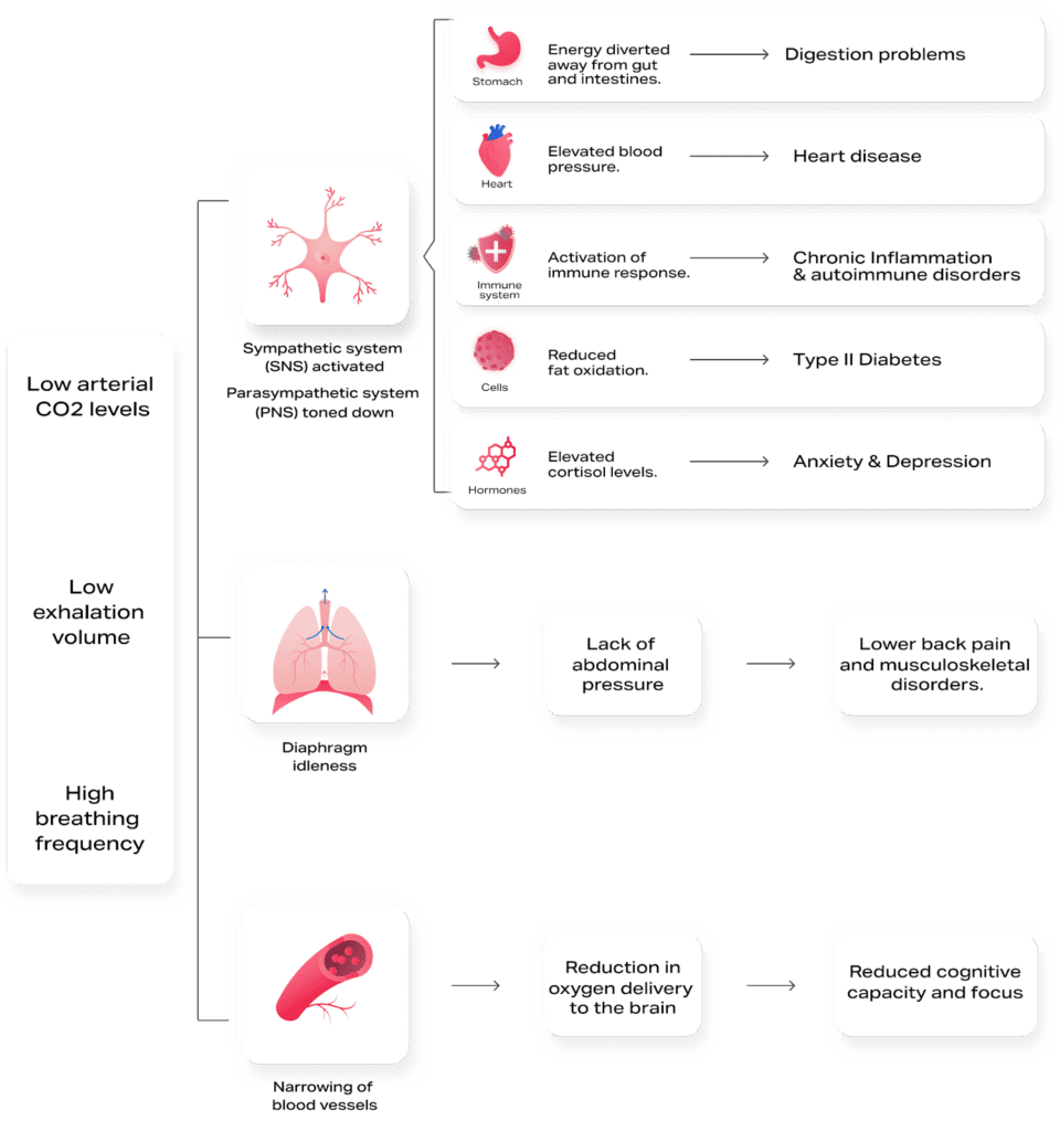Breathing continuously faster and shallower, a condition called Chronic Hyperventilation Syndrome (CHS), causes a chronic hyper-activation of SNS setting our body in a perpetual state of increased stress. Engagement of SNS signals to our body the presence of danger and thus triggers a chain of reactions aimed to prime us for facing it. Although these processes have been developed over thousands of years of evolution and can be life-saving given their effect of setting us ready to respond to threats, their constant activation causes a cascade of negative repercussions. Here are the main mechanisms and physiological systems affected: